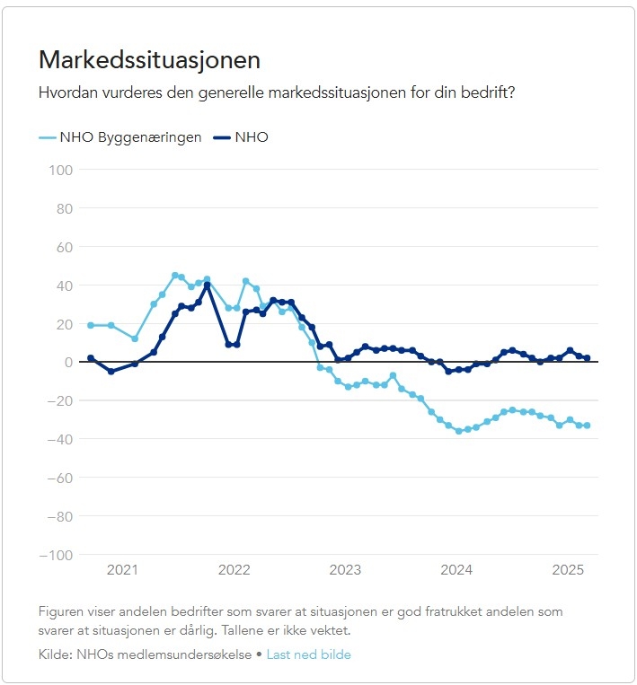 I undersøkelsen oppga 21 prosent av respondentene at markedssituasjonen var god, mens 25 prosent vurderte den som dårlig. I februar var andelene henholdsvis 22 og 24 prosent. For byggenæringens medlemmer rapporterte 47 prosent om et dårlig marked i dag, mens kun 12 prosent mente det var et bra marked. Det er tilnærmet uendret fra tallene for byggenæringen i februar.